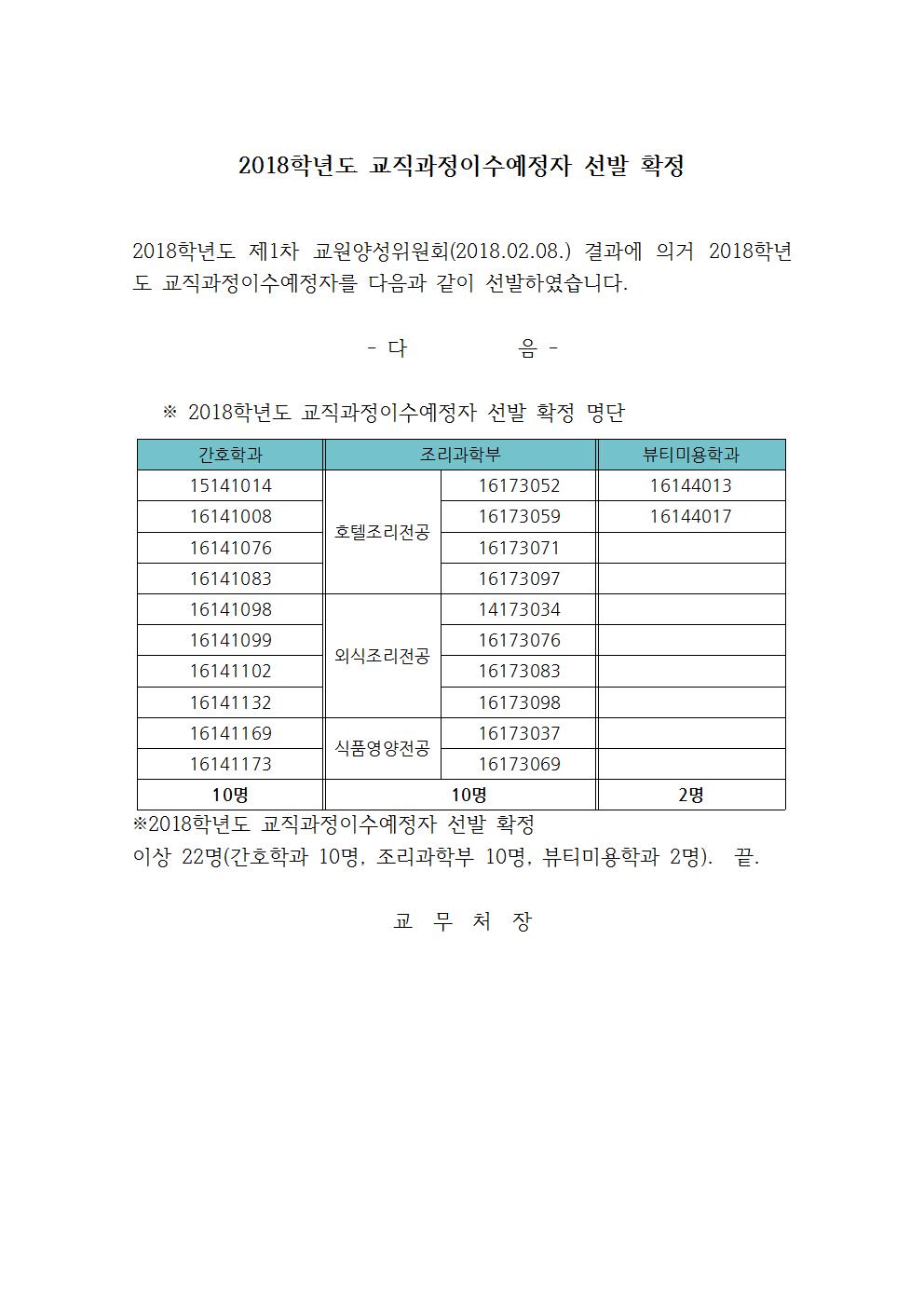 2018학년도 교직과정이수예정자 선발 확정